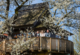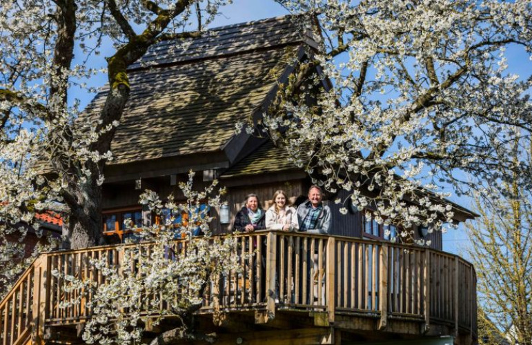 Das Haus ist in und um einen alten Kirschbaum herum gebaut, ohne diesen zu belasten: Es steht auf Stelzen, ist in Holzrahmenbauweise errichtet und ruht auf Schraubfundamenten, um die Baumwurzeln zu schützen. Sie erreichen das Baumhaus über eine bequeme, breite Treppe. Im Inneren finden Sie moderne und hochwertige Möbel vor.