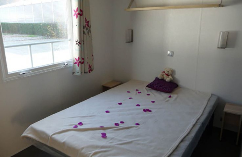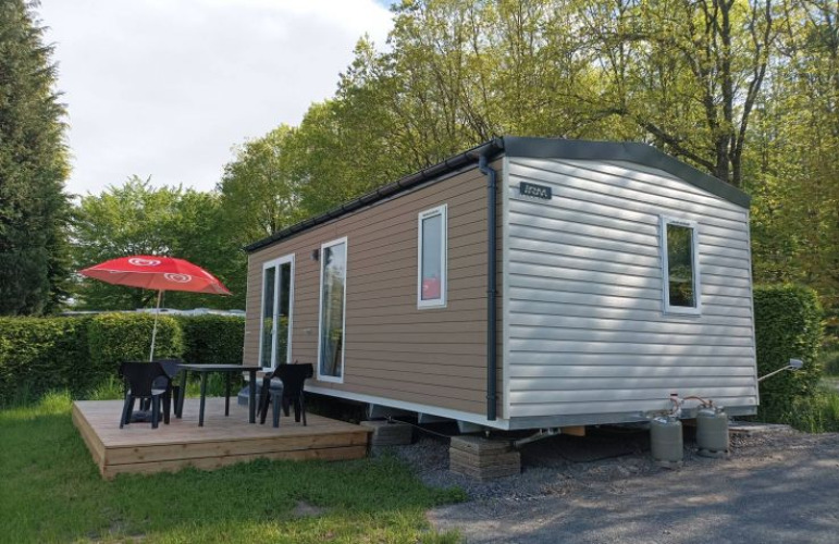 Die Mobilheime und Chalets der IRM Riviera-Serie liegen in schöner Lage am Waldrand und bieten rund 29 m² Wohnfläche. Sie verfügen über ein Doppelbett (140 x 190 cm) und zwei Einzelbetten (je 80 x 190 cm), ein Wohnzimmer mit separatem Essbereich und Küche, ein Duschbad und eine separate Toilette. Die Küche ist mit einem 4-flammigen Gasherd und einem 115-Liter-Kühlschrank ausgestattet. Die Holzterrasse vor dem Mobilheim ist mit Gartenstühlen, einem Tisch und einem Sonnenschirm ausgestattet, ideal um die Natur zu genießen.