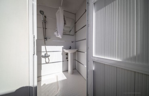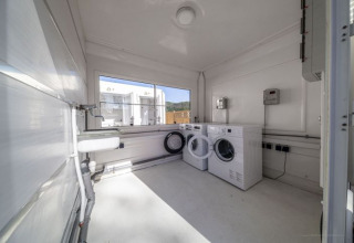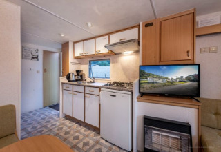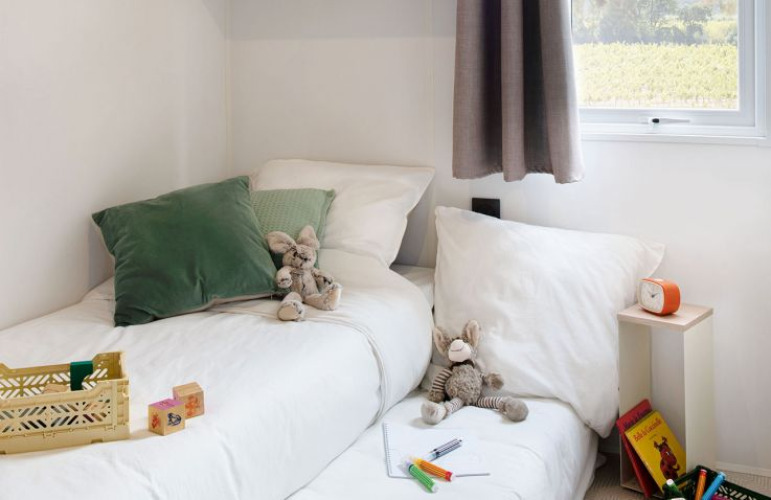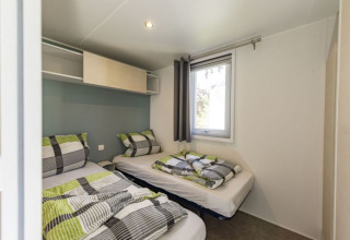 Als größtes Mobilheim befindet sich das "Riviera 3" ebenfalls auf dem Hochplateau mit Blick nach Süden und einem schönen Panorama über den Rhein. Es verfügt über drei Schlafzimmer: ein Hauptschlafzimmer, ein Zimmer mit zwei Einzelbetten und ein Einzelzimmer, plus ein zusätzliches ausklappbares Bett. Die voll ausgestattete Küche mit Geschirrspüler, Cerankochfeld, Mikrowelle und Kaffeemaschine, ein Badezimmer mit großer Dusche, eine separate Toilette und Satellitenfernsehen im Wohnzimmer sorgen für einen komfortablen Aufenthalt. Gartenmöbel und ein Grill sind ebenfalls vorhanden.