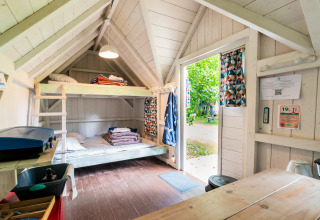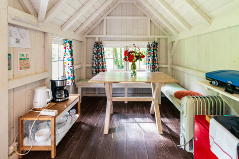 Der Gemeinschaftsraum ist ein Ort, der allen Gästen offensteht und an dem das Zusammensein im Vordergrund steht. Der große Tisch ist ideal für eine Mahlzeit oder ein Spiel, auch bei Regenwetter. Hier können sich die Gäste treffen, Wander- und Kletterrouten besprechen oder ein ruhiges Plätzchen zum Lesen finden. Bücher im Regal und ein kleines Klavier sorgen für Entspannung und Unterhaltung. Für Kinder stehen verschiedene Spiele zur Verfügung. Darüber hinaus bietet der Park einen Fahrradverleih und eine Ladestation für Elektroautos. Regelmäßig gibt es neue Überraschungen, so dass der Platz immer zu Zweisamkeit, Entspannung und Spaß einlädt.