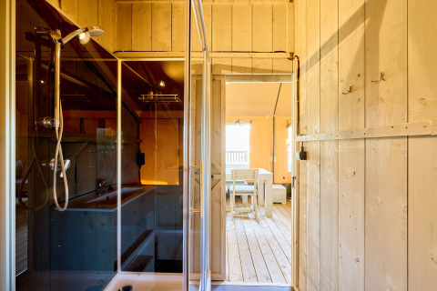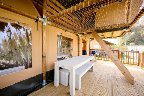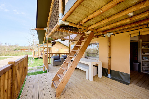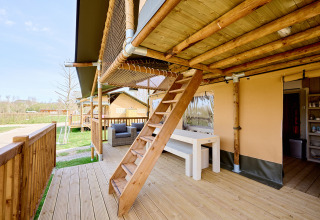 Auf der großzügigen Terrasse stehen ein Picknicktisch und zwei Relaxsessel für lange Sommerabende bereit. Die bekannte Villatent-Hängematte und ein Outdoorchef BBQ vervollständigen das Leben im Freien. Die Zelte stehen zusammen in einer grünen Allee am Rande von Camping Spina Family Collection, mit Blick auf das umliegende Grün und alle Einrichtungen des Campingplatzes in unmittelbarer Nähe.