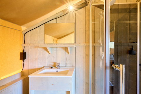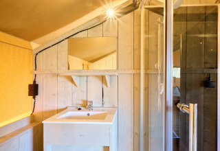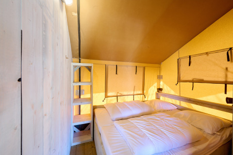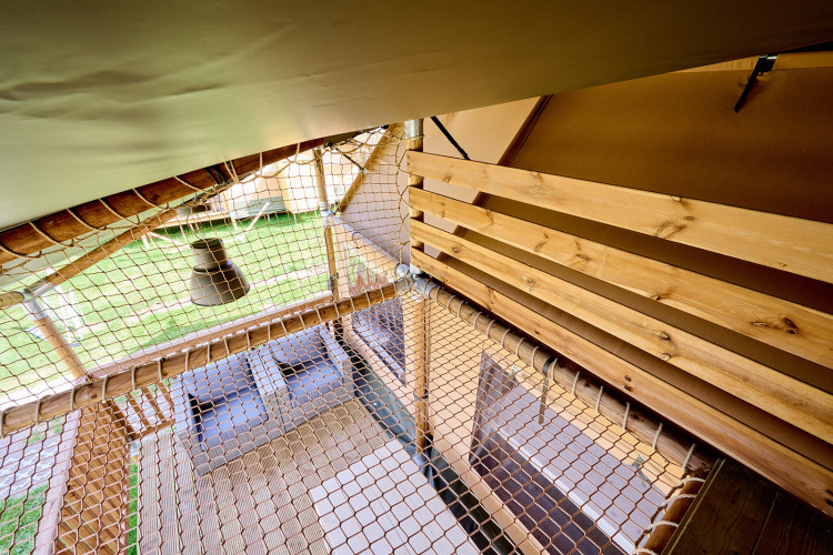 Die Klimaanlage sorgt hier zu jeder Jahreszeit für einen angenehmen Aufenthalt, während das einzigartige Obergeschoss mit Hängematte und Mini-Zelt diese Lodge für Familien zu etwas ganz Besonderem macht. Das Villatent Ranger mit 35 m² bietet Platz für sechs Personen und verfügt über zwei Schlafzimmer mit zwei Meter langen Betten: eines mit Doppelbett und eines mit zwei Etagenbetten. Das Zelt hat ein eigenes Badezimmer mit geräumiger Duschkabine, Toilette und Waschbecken. Im Wohnbereich findest du eine komplett ausgestattete Küche mit Vier-Flammen-Herd, Kühlschrank mit Gefrierfach, Geschirrspüler und einer Nespresso-Maschine. Am großen Esstisch und auf dem Sofa kann man nach einem Tag draußen wunderbar zusammensitzen.
