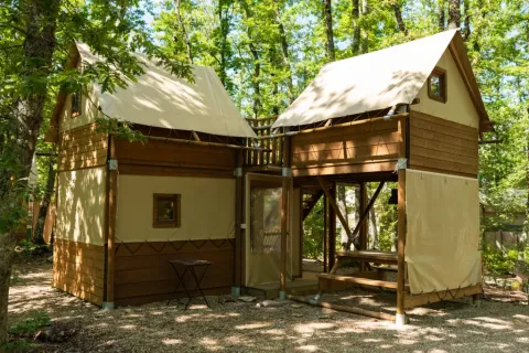 Erleben Sie das ultimative Outdoor-Abenteuer im Air Dreamer 2, wo Luxus und Natur perfekt miteinander verschmelzen. Diese einzigartige zweistöckige Unterkunft bietet ein echtes Glamping-Gefühl. Im oberen Stockwerk befinden sich zwei gemütliche Schlafzelte—eines mit einem Doppelbett und eines mit zwei Einzelbetten—die über eine Außentreppe mit einer Panoramaterrasse verbunden sind.