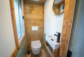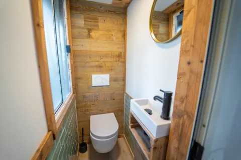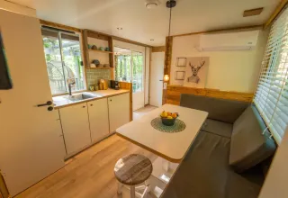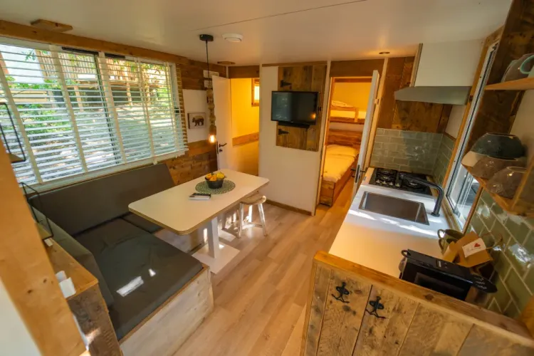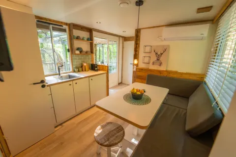 Entdecken Sie die Bohemian Lodge, ein bezauberndes Zuhause inmitten der Natur, wo Komfort auf Nachhaltigkeit trifft. Dieses großzügige Familienrefugium bietet die perfekte Auszeit vom Alltagsstress. Im Inneren erwartet Sie ein einladender Wohnbereich mit TV, Klimaanlage und einer komplett ausgestatteten Küche inklusive Nespresso-Maschine.
