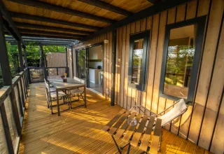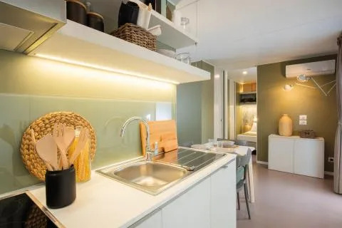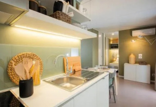 Cottage Next L Evo ist ein zeitgemäßes, von der Natur inspiriertes Refugium, das für einen ruhigen und komfortablen Urlaub konzipiert wurde. Das große Fenster holt die Natur nach drinnen, während das moderne Dekor und die natürliche Farbpalette eine ruhige, einladende Atmosphäre schaffen.