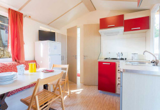 Es hat eine Fläche von etwa 24 qm und bietet Platz für bis zu 4 Erwachsene und 2 Kinder. Es besteht aus einem Wohnzimmer mit Tisch, Stühlen, einem Schlafsofa, einer Kochnische, die mit einem Standkühlschrank mit Gefrierfach oder einem Kühlschrank mit Eisfach, einem 4-Flammen-Gasherd, einer Spüle, Töpfen, Pfannen und Geschirr ausgestattet ist. Der Schlafbereich besteht aus 2 Schlafzimmern, eines mit einem Doppelbett und eines mit 2 Einzelbetten sowie einem dritten Hochbett und 1 Schlafsofa. Die Unterkunft verfügt über 1 Badezimmer, das in 2 Räume unterteilt ist: 1 Dusche und Waschbecken sowie 1 Toilette und Waschbecken. Ein überdachter Holzbalkon oder ein weißer Pavillon mit Tisch und Stühlen vervollständigen die Unterkunft.