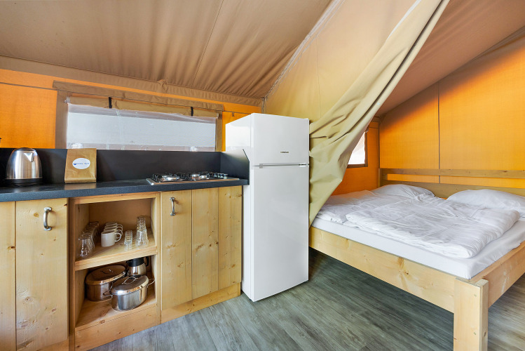 Dieses Safarizelt ist mit einer Holzveranda unter einem geräumigen Sonnensegel ausgestattet, so dass Sie bei jedem Wetter draußen sitzen können. Das Vordach zwischen der Veranda und dem Wohnbereich kann je nach Wunsch teilweise oder ganz hochgezogen werden, um noch mehr Wohnraum zu schaffen: So können Sie die freie Natur maximal genießen und sind dennoch überdacht. Im Inneren finden Sie eine komfortable Küche mit Kühlschrank und Gefrierfach, einen Tisch, Stühle und einen Kleiderschrank für all Ihre Urlaubskleidung.
