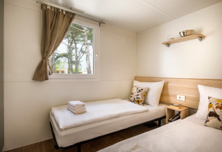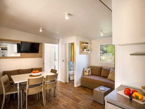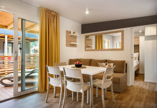 Erleben Sie die perfekte Verbindung von Komfort und Natur im San Marino Home für 6+2, einer modernen Glamping-Unterkunft im Herzen von Valamar Camping San Marino. Diese großzügige Mobilheim-Unterkunft wurde für Familien oder Gruppen entworfen, die Wert auf Bequemlichkeit und Stil legen, und sorgt dafür, dass Ihr Urlaub auf der Insel Rab unvergesslich wird.