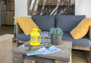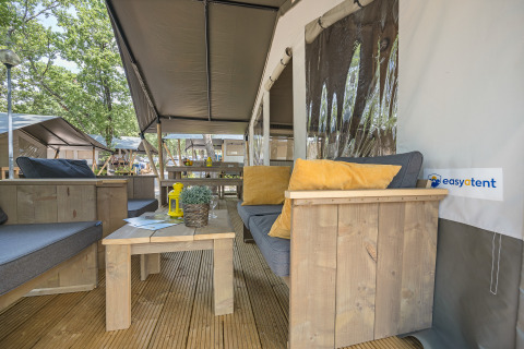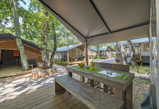 Draußen genießt du eine großzügige, überdachte Holzveranda mit Loungeset – der ideale Ort, um draußen zu entspannen. Durch das aufrollbare Zeltstoff verbindest du ganz einfach den Innen- mit dem Außenbereich und schaffst zusätzlichen Wohnraum. Hier erlebst du das Beste vom Glamping: komfortables Wohnen mitten in der Natur mit allen Annehmlichkeiten in Reichweite.