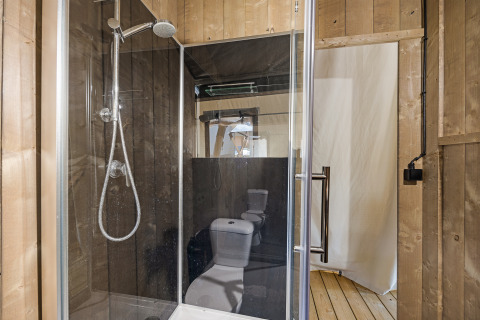 Dieses großzügige Safaritent von 47 m² vereint echtes Campinggefühl mit modernem Komfort. Im Inneren findest du einen gemütlichen Wohnbereich mit Esstisch, Sitzecke und einer komplett ausgestatteten Küche mit unter anderem einem 4-Flammen-Gasherd, Kühlschrank mit Gefrierfach, Mikrowelle, Kaffeemaschine und Wasserkocher. Das Zelt verfügt über ein eigenes Badezimmer mit Dusche, Toilette und Waschbecken, was für zusätzlichen Komfort während deines Aufenthalts sorgt. Dank der Klimaanlage bleibt es auch an warmen Tagen angenehm kühl.