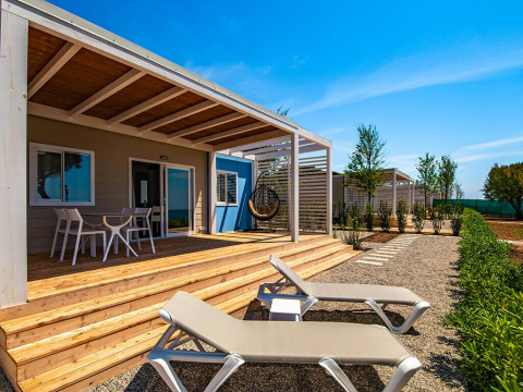 Das Camping Home Next bietet mit einer Gesamtwohnfläche von 30 m² einen komfortablen Aufenthalt, ergänzt durch eine großzügige, möblierte Terrasse von 20 m². Die moderne Unterkunft ist für bis zu 5 Gäste ausgelegt und mit Klimaanlage sowie kostenlosem WLAN ausgestattet. Im Inneren finden Sie ein gemütliches Wohnzimmer mit Schlafsofa und TV sowie eine komplett ausgestattete Küchenzeile mit Kühlschrank, Induktionskochfeld, Mikrowelle und Kaffeemaschine. Die Unterkunft verfügt über zwei Schlafzimmer: ein Hauptschlafzimmer mit Doppelbett (160x190 cm) und ein zweites Schlafzimmer mit zwei Einzelbetten (80x190 cm). Es gibt außerdem zwei Badezimmer mit Duschen und Haartrocknern.