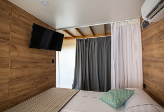 Im Inneren finden Sie ein Schlafzimmer mit einem Doppelbett sowie ein weiteres mit einem Etagenbett und einem Einzelbett, sodass bis zu fünf Personen bequem schlafen können. Das private Badezimmer ist mit einer Dusche, einem Waschbecken und einer Toilette ausgestattet.