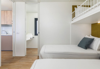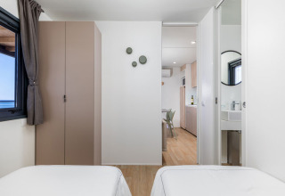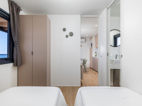 Erwachen Sie zum Funkeln der Adria im brandneuen Camping Home Sea View auf dem Camping Arena Stupice. Dieses luxuriöse Mobilheim (40 m²) liegt direkt am Strand und bietet aus fast jedem Zimmer einen ununterbrochenen Meerblick. Genießen Sie Ihr Frühstück in der Sonne oder ein Glas Wein zum Sonnenuntergang auf der privaten Holzterrasse. Im Inneren sorgen lichtdurchflutete Räume mit Holzoptik-Böden und modernen Möbeln für ein entspanntes, maritimes Ambiente. Zwei Schlafzimmer, zwei Badezimmer mit begehbaren Duschen und ein gemütliches Hochbett schaffen die perfekte Unterkunft für Familien. Die voll ausgestattete Küche macht Selbstverpflegung mühelos, während Klimaanlage, Moskitonetze und Satelliten-TV zusätzlichen Komfort bieten. Haustierfreundlich und für bis zu fünf Gäste konzipiert, vereint dieses Refugium am Meer modernes Wohnen mit der Schönheit der Natur – nur wenige Schritte von den Wellen entfernt.