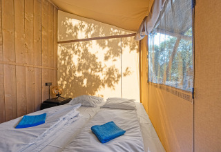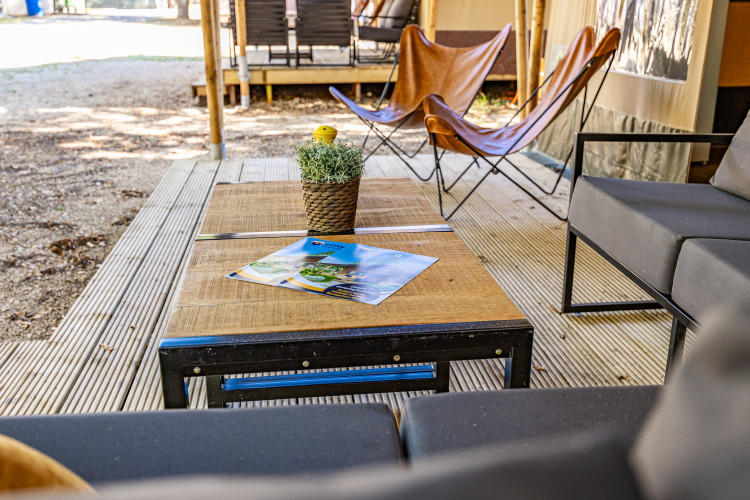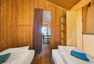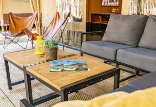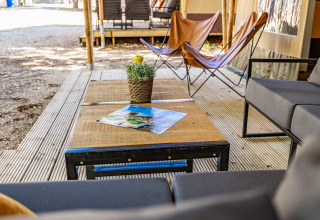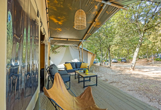 Erleben Sie den Charme des luxuriösen Campings in der geräumigen Safaritent Lodge für 8 Personen. Genießen Sie ein stimmungsvolles Interieur aus Holz und eine überdachte Terrasse mit bequemer Loungegarnitur – ideal, um gemeinsam lange Abende draußen zu verbringen. Die komplett ausgestattete Küche mit großem Küchenblock, Tisch und Stühlen macht das Kochen einfach und gesellig. Im Inneren befinden sich drei Schlafzimmer mit insgesamt acht Schlafplätzen, einschließlich Decken und Kissen, so dass jeder erholsam schläft. Das Zelttuch zwischen Veranda und Wohnbereich kann geöffnet werden, für noch mehr Raum und Licht. Mit dem Sanitärgebäude in kurzer Laufdistanz bleibt die Lodge praktisch und stilvoll. Perfekt für einen Glamping-Urlaub, in dem Komfort und Naturerlebnis mühelos zusammenkommen.