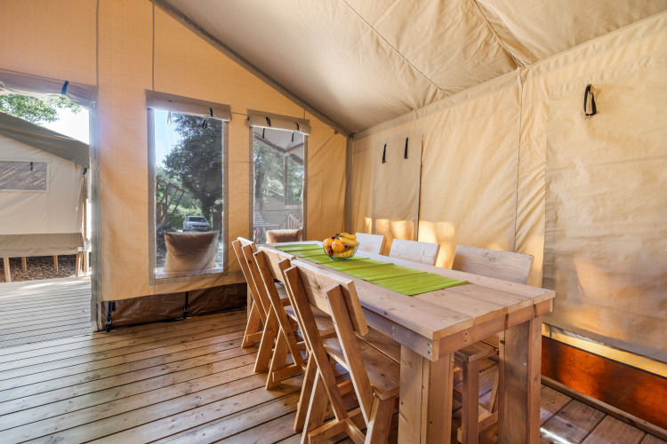 Dieses robuste Safarizelt verfügt über eine hölzerne Veranda und ein luxuriöses Loungeset unter einem geräumigen Sonnensegel, so dass Sie bei jedem Wetter draußen sitzen können. Auf der großen Terrasse können Sie die freie Natur in vollen Zügen genießen und sind dabei trotzdem überdacht. Genießen Sie die Ruhe und Stille der kroatischen Natur mit einem Glas Wein und einem Buch.