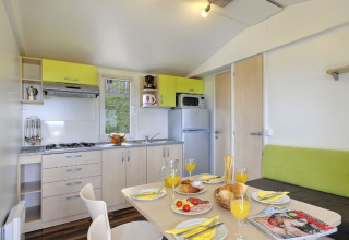 Genießen Sie ein entspannendes Glamping-Erlebnis in der Orsera Home for 4+2 im Camping Orsera, ideal für Familien oder kleine Gruppen. Dieses komfortable Mobilheim bietet Platz für 4 Erwachsene und 2 Kinder und verfügt über zwei Schlafzimmer, ein Schlafsofa und zwei Badezimmer. Der helle Wohnbereich und die voll ausgestattete Küche sorgen für Komfort, während die großzügige, teilweise überdachte Holzterrasse zum Essen und Sonnenbaden mit herrlichem Meerblick einlädt. Nur 150–250 Meter vom Strand entfernt, können Sie die Adriaküste in vollen Zügen genießen. Klimaanlage, WLAN und Handtücher sind vorhanden; Bettwäsche muss mitgebracht werden. Haustiere und Babybetten sind nicht erlaubt. Es ist die ideale Kombination aus Natur, Komfort und Freiheit.