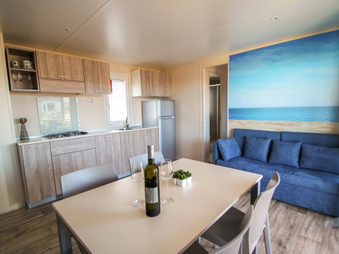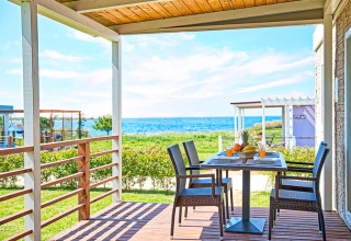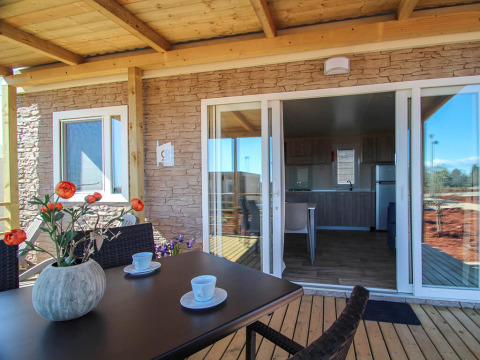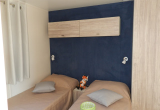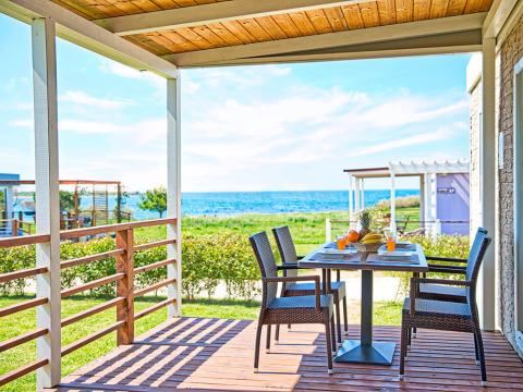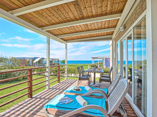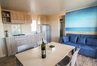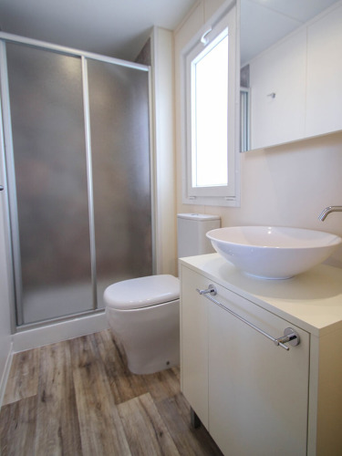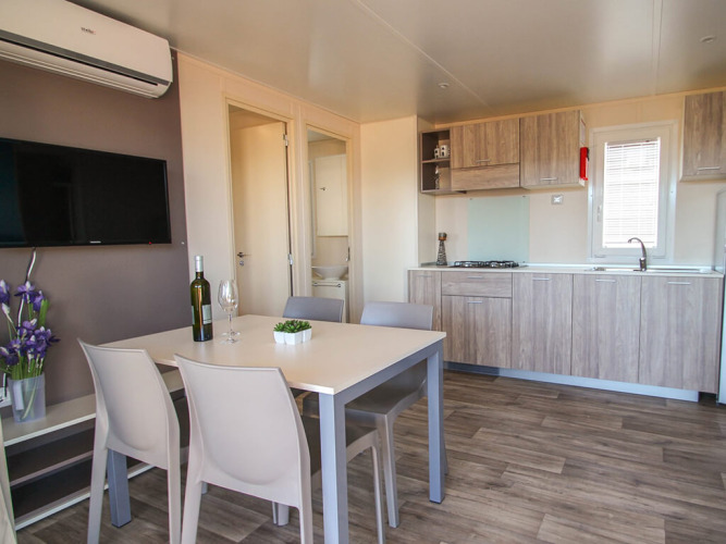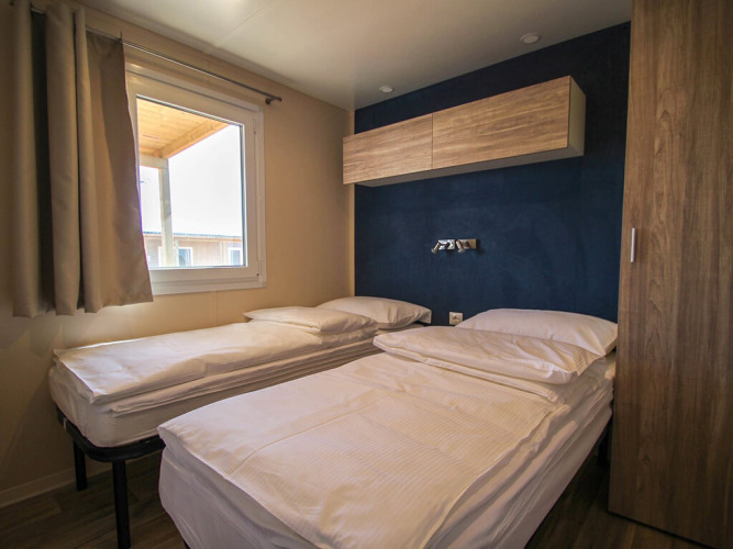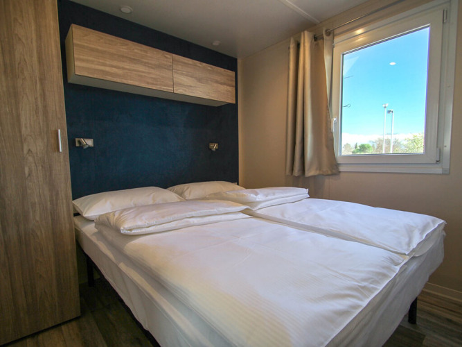 Genießen Sie ein erstklassiges Glamping-Erlebnis im Park Riviera 2 Bedrooms Mobilheim auf Camping Park Umag. Nur 110 Meter vom Meer entfernt erwartet Sie eine großzügige überdachte Terrasse mit Sonnenliegen und Esstisch – ideal für den Morgenkaffee oder Mahlzeiten im Freien mit Blick auf die Adria. Im Inneren erwarten Sie eine moderne offene Küche (mit Geschirrspüler, Mikrowelle und Kaffeemaschine), ein gemütlicher Wohnbereich und Platz für vier Gäste. Es gibt zwei Schlafzimmer (eines mit Doppelbett, eines mit zwei Einzelbetten) und zwei private Badezimmer mit Dusche und WC. Haustiere sind willkommen (bis zu 3), und Annehmlichkeiten wie Klimaanlage, WLAN und Satelliten-TV stehen zur Verfügung. Mit Zugang zu den Glamping-Einrichtungen von Camping Park Umag ist dieses Mobilheim die ideale Wahl für Familien und Paare, die Komfort, Natur und Entspannung am Meer für einen unvergesslichen Urlaub suchen.