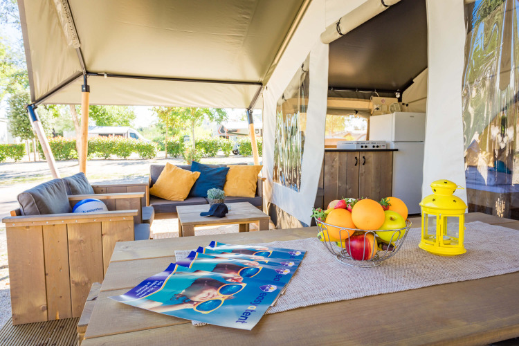 Während Ihres Glamping-Urlaubs wohnen Sie mit maximal 5 Personen in einem sehr geräumigen Safarizelt. Auf diese Weise campen Sie stilvoll und mit allen Annehmlichkeiten ausgestattet. Das stimmungsvolle und luxuriöse Safarizelt ist vollständig mit Inventar, Möbeln und einer Küche ausgestattet.