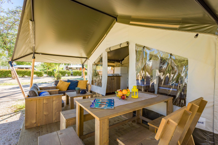 Jedes Safarizelt ist mit einer Holzveranda und einer luxuriösen Lounge unter einer geräumigen Markise ausgestattet, so dass Sie bei jedem Wetter draußen sitzen können. Die Plane zwischen der Veranda und dem Wohnbereich kann ganz oder teilweise aufgespannt werden, je nach Wunsch, um noch mehr Wohnraum zu schaffen: So können Sie die freie Natur genießen und sind dennoch geschützt. Im Inneren finden Sie eine komfortable Küche mit einem großen Kühlschrank mit Gefrierfach, einen Tisch, Stühle und eine Garderobe für all Ihre Urlaubskleidung.