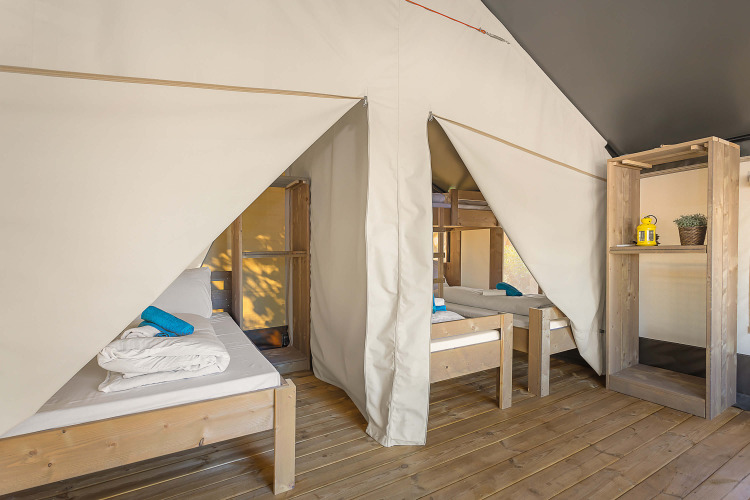 Dieses luxuriöse Safarizelt bietet standardmäßig Platz für fünf Personen: 1x Doppelbett (1,60 x 2,00), 1x Einzelbett (0,80 x 2,00) und ein sehr stabiles Etagenbett (2x 0,80 x 2,00). Bettdecken und Kopfkissen sind beim Glamping selbstverständlich Standard. Sie müssen Ihre eigenen Laken, Bettbezüge und Kissenbezüge mitbringen oder Sie können sie einfach mieten. Sie können auch das Babykit mieten, das aus einem sicheren Kinderbett und einem stabilen Hochstuhl besteht.