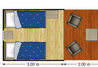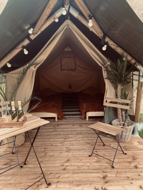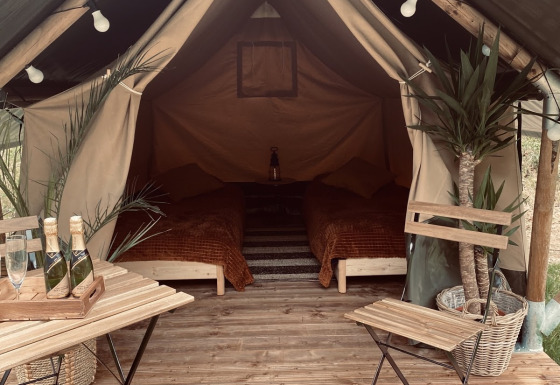 Dieses kleinere, einzigartige Safarizelt ist mit allem Komfort für den perfekten Glamping-Urlaub ausgestattet! Durch die Holzelemente und die aufrollbare Vorderseite kommt das echte Outdoor-Gefühl des Campens auf – mit dem gesamten Komfort von zu Hause. Das Zelt verfügt über eine gemütliche Veranda mit Vordach, um herrlich draußen verweilen zu können. Außerdem gibt es zwei Einzelbetten im Zelt, wobei Bettdecken und Kissen inklusive sind. Diese gemütliche Duo Lodge ist perfekt für Reisende, die inmitten der Natur in einer komfortablen Unterkunft vollkommen entspannen möchten! Es gibt keinen Strom und keine sanitären Anlagen bei diesem Zelt.