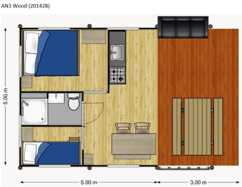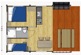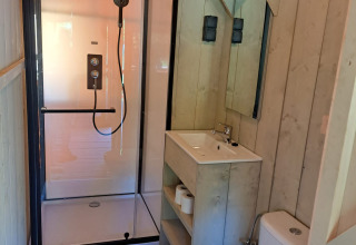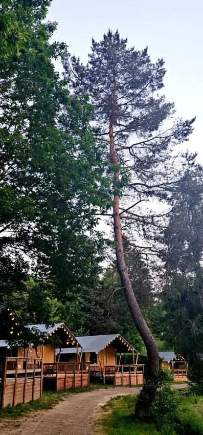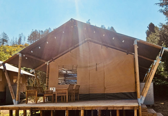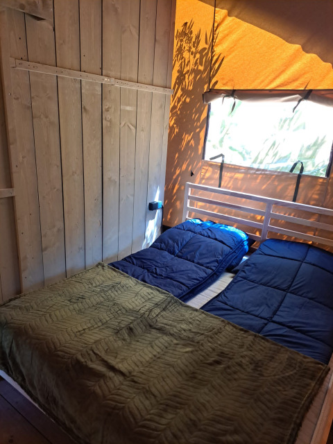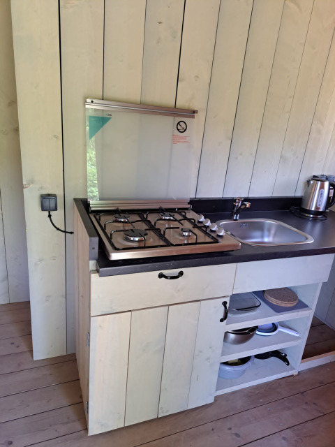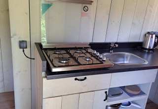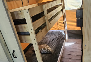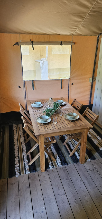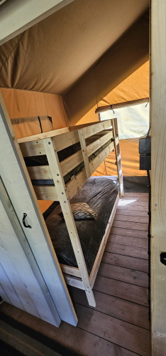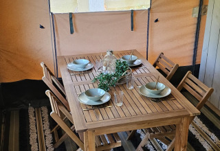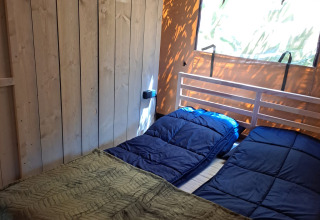 Dieses einzigartige Safarizelt ist mit allem Komfort für den perfekten Glamping-Urlaub ausgestattet! Durch die Holzelemente und die aufrollbare Front entsteht das echte Outdoor-Gefühl des Campings, mit allem Komfort wie zu Hause. Das Zelt verfügt über eine gemütliche Veranda mit Vordach, um herrlich draußen verweilen zu können. Das Safarizelt hat eine komplett ausgestattete Küche mit Inventar und ist mit einem vierflammigen, gesicherten Gasherd, einem Kühlschrank, einer Kaffeemaschine und einem Wasserkocher ausgestattet. Das Safarizelt verfügt zudem über ein eigenes Badezimmer mit Dusche, Toilette und Waschbecken. Außerdem gibt es zwei Schlafkabinen im Zelt. In einer Schlafkabine steht ein Doppelbett und in der anderen ein Etagenbett.