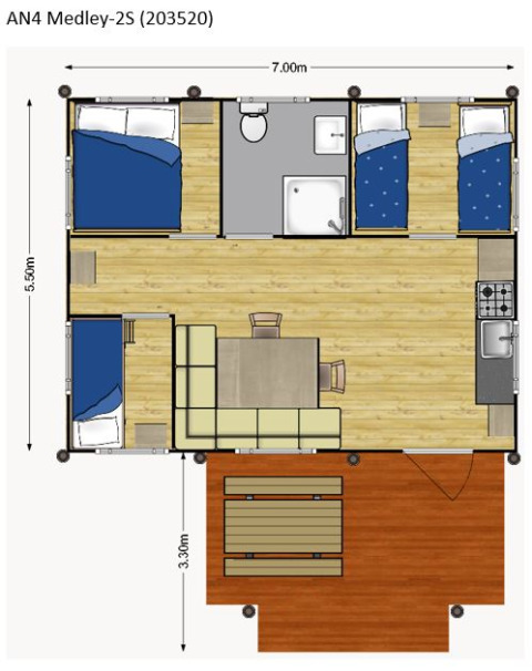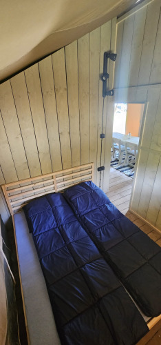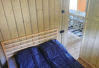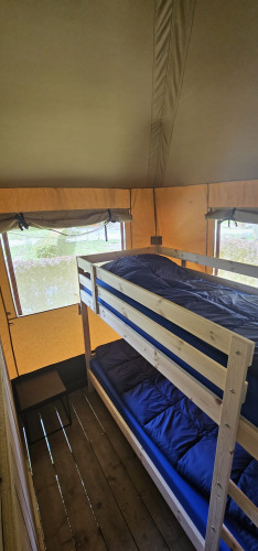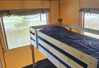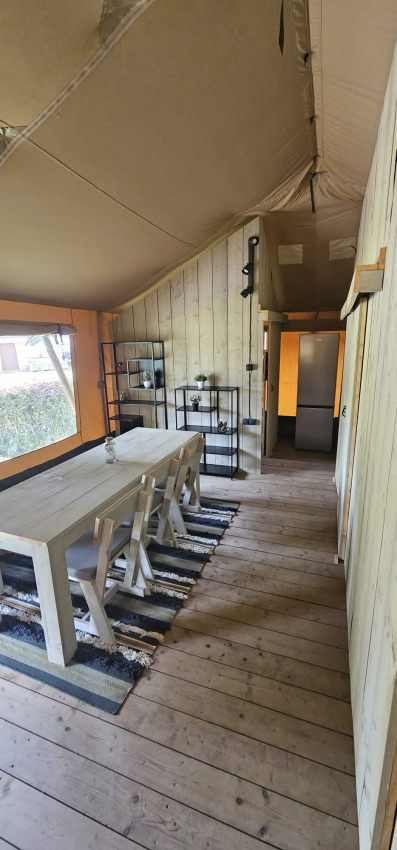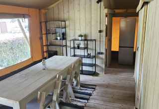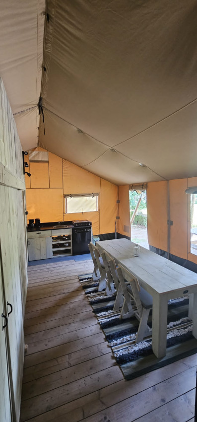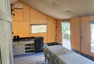 Dieses einzigartige Safarizelt ist mit allem Komfort für den perfekten Glamping-Urlaub ausgestattet! Durch die Holzdetails und die aufrollbare Vorderseite bekommt man das echte Outdoor-Gefühl des Campings, kombiniert mit allem Komfort von zu Hause. Das Zelt verfügt über eine gemütliche Veranda mit Vordach, damit man herrlich draußen verweilen kann. Das Safarizelt hat eine komplett ausgestattete Küche mit Inventar und beinhaltet ein vierflammiges, sicheres Gasgerät, einen großen Kühlschrank, eine Spülmaschine, eine Kaffeemaschine und einen Wasserkocher. Das Safarizelt ist außerdem mit einem eigenen Badezimmer mit Dusche, WC und Waschbecken ausgestattet. Zusätzlich gibt es drei Schlafkabinen im Zelt. In zwei Schlafkabinen steht ein Doppelbett und in der dritten Schlafkabine befindet sich ein Etagenbett.