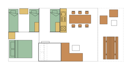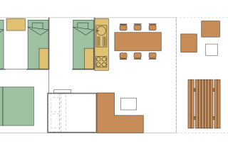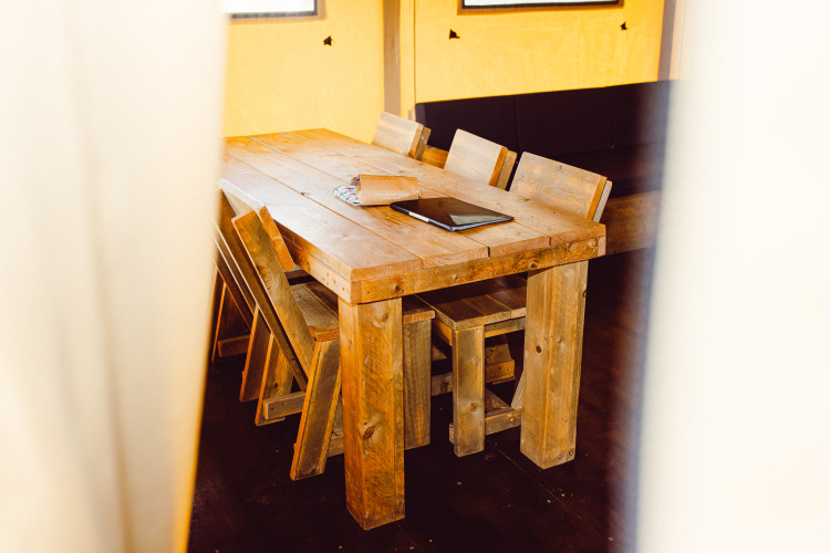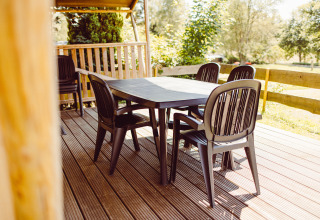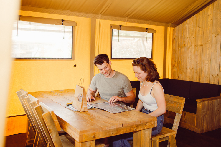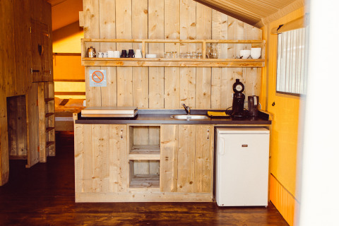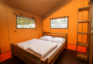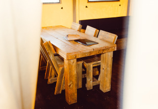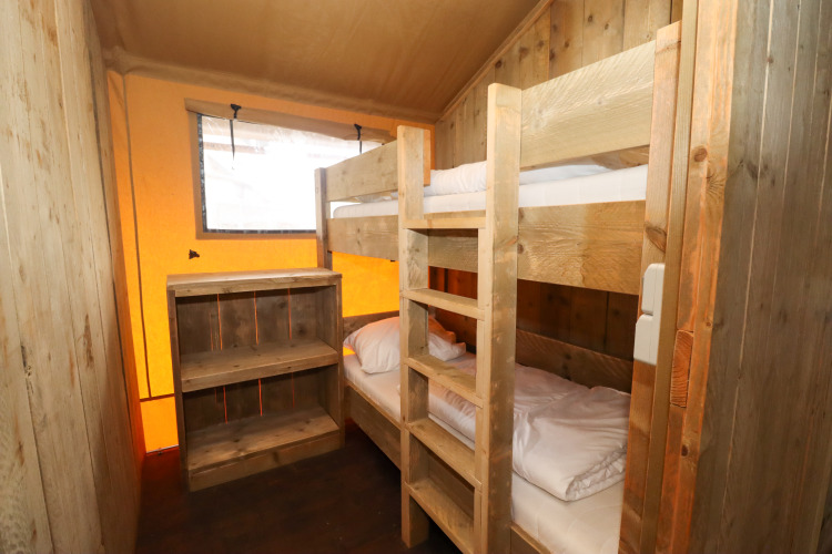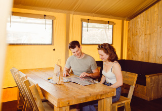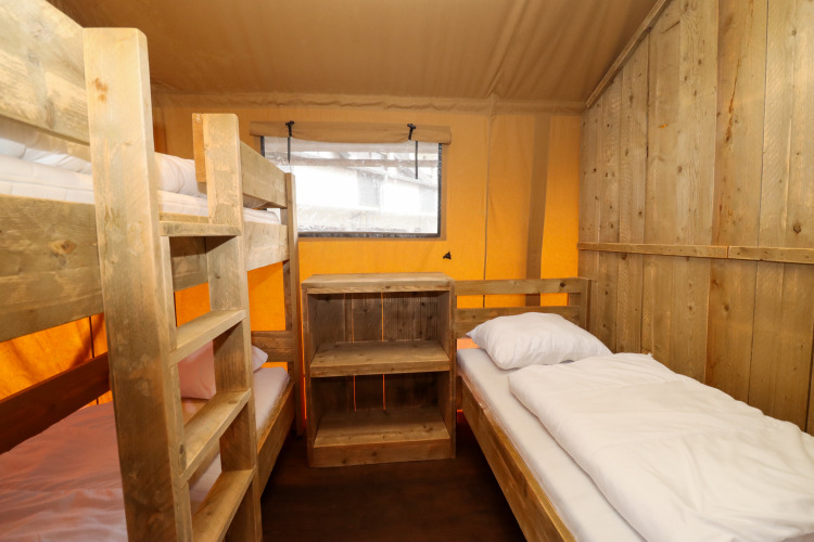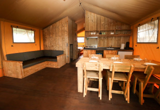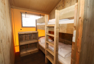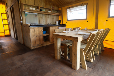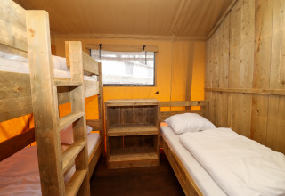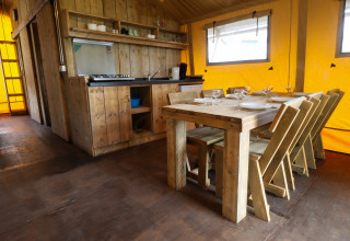 Suchen Sie nach einem einzigartigen und komfortablen Camping-Erlebnis mit der ganzen Familie? Dann ist ein Aufenthalt in diesem stimmungsvollen Safarizelt genau das Richtige für euch. Dieses geräumige Zelt bietet Platz für bis zu 8 Personen und ist mit allem Komfort ausgestattet. Im Inneren findet ihr einen gemütlichen Wohnbereich mit Esstisch und eine praktische Küche, in der ihr mit einer Senseo-Kaffeemaschine ganz einfach euren Tag beginnen könnt. Es gibt vier separate Schlafbereiche, darunter ein Alkoven mit Doppelbett, ein Schlafzimmer mit einem Etagenbett sowie einem Einzelbett, ein Zimmer mit einem Bett und ein Hauptschlafzimmer mit Doppelbett. Draußen genießt ihr auf der überdachten Terrasse die Ruhe und Natur um euch herum. Das private Badezimmer befindet sich direkt neben dem Zelt. Achtung: Es gibt keine Heizung und kein warmes Wasser in der Küche. Hunde sind gegen Aufpreis willkommen, Rauchen ist nicht gestattet.