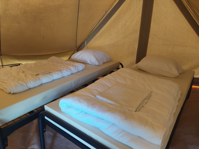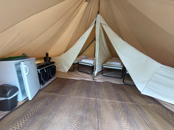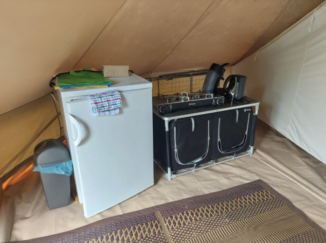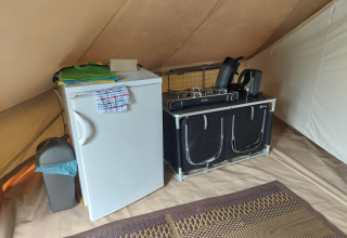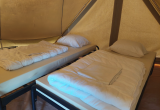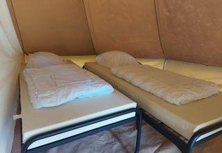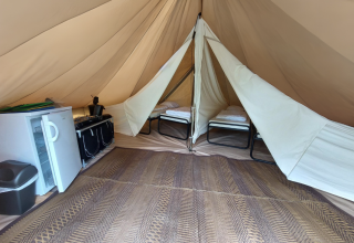 Erleben Sie das ultimative Campinggefühl in diesen stimmungsvoll eingerichteten Tipi-Zelten – perfekt für einen besonderen Urlaub in der Natur. Die Zelte sind für maximal 4 Personen geeignet und verfügen über einen gemütlichen Wohnbereich mit einem Tisch und vier Stühlen – ideal für ein Spiel oder ein gemeinsames Essen. In der Küchenzeile finden Sie einen Kühlschrank und eine Senseo-Kaffeemaschine, um gut in den Tag zu starten. Es gibt zwei separate Schlafbereiche mit Einzelbettdecken und Kissen. Bitte beachten Sie, dass es in den Zelten keine Heizung und kein (privates) Badezimmer gibt. Hunde und das Rauchen sind nicht erlaubt, sodass jeder eine frische und ruhige Umgebung genießen kann.