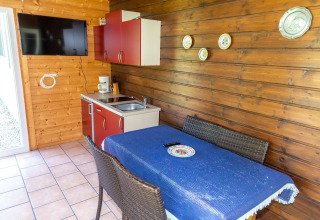 Innen ist der Blasge Bungalow 2 einfach und komfortabel eingerichtet und bietet alles, was Sie für einen entspannten Urlaub zu zweit brauchen. Es gibt eine komplett ausgestattete Küche mit Geschirrspüler und Mikrowelle, damit das gemeinsame Kochen kein Problem ist. Nach einem Tag im Freien genießen Sie eine ausgiebige Dusche, entspannen sich auf dem Sofa oder öffnen eine Flasche Wein auf der überdachten Veranda.