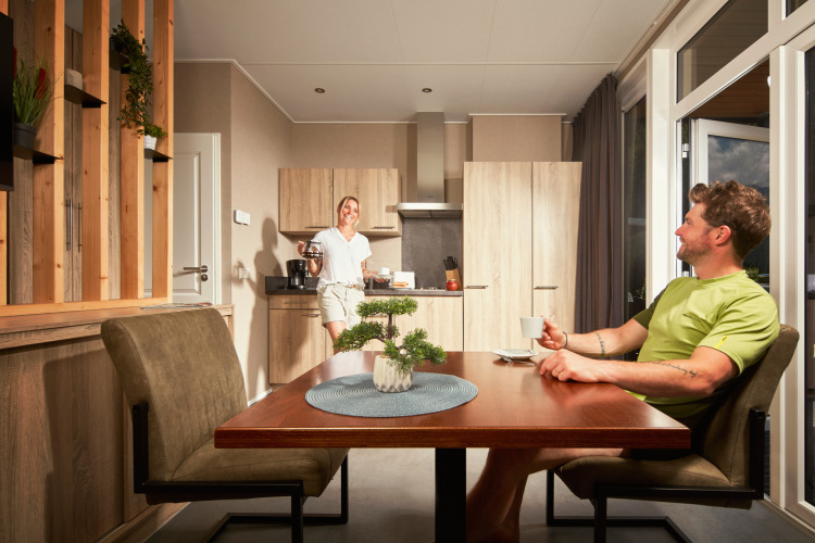 Der zentrale Wohnbereich verfügt über eine moderne Küchenzeile und einen Esstisch, während das Schlafzimmer mit einem bequemen Doppelbett ausgestattet ist. Das Badezimmer hat ein Waschbecken, eine Dusche und eine Toilette.