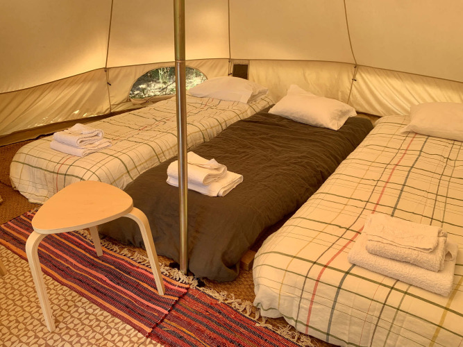 Erlebe das ultimative Glamping-Feeling in diesem stimmungsvollen 5-Meter-Glockenzelt von Oliveira! Ausgestattet mit einem bequemen Doppelbett und zwei Einzelmatratzen, bietet dieses Zelt Platz für eine Familie. Für ein Kind ist eine zusätzliche Matratze vorhanden. Die Bettwäsche, Handtücher und Seife werden vor Ort hergestellt. Das Zelt ist komplett ausgestattet mit einem Kühlschrank, Küchenutensilien, einem Wasserkocher und Gläsern. Tisch und Stühle vervollständigen es. Gemeinschaftsbäder und Duschen sind zu Fuß erreichbar. Zusätzliche Kochutensilien? Die sind auf Anfrage erhältlich!