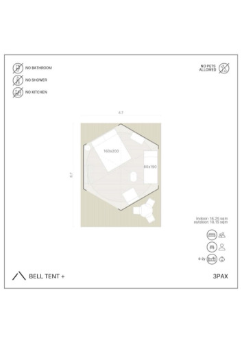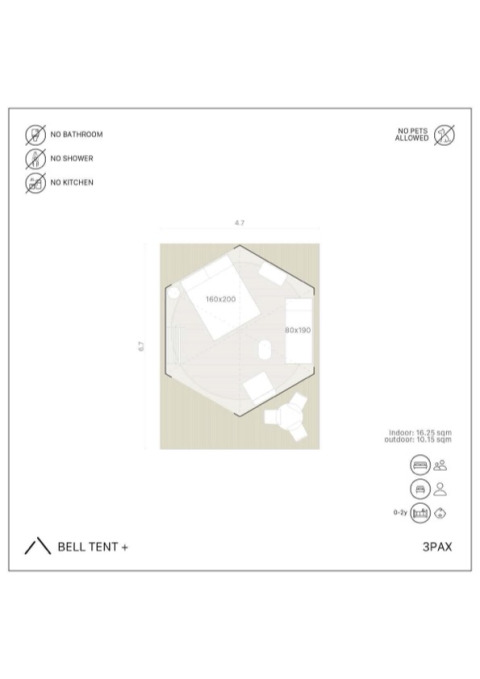 Dank der Holzplattform rund um das Zelt genießt du auf der Terrasse die Ruhe und die Natur. Im Inneren findest du ein komfortables Doppelbett, ein kleines Kleiderregal und eine Mini-Bar mit Mikrowelle und Kaffeemaschine. Obwohl das Zelt keine eigene Küche und kein eigenes Bad hat, befinden sich die gemeinschaftlichen Sanitäranlagen nur wenige Meter entfernt. Handtücher und Bettwäsche sind inklusive und sorgen für einen unbeschwerten Aufenthalt. Das Bell Tent+ ist perfekt für Paare, die ein einfaches, aber stilvolles Glamping-Erlebnis suchen.