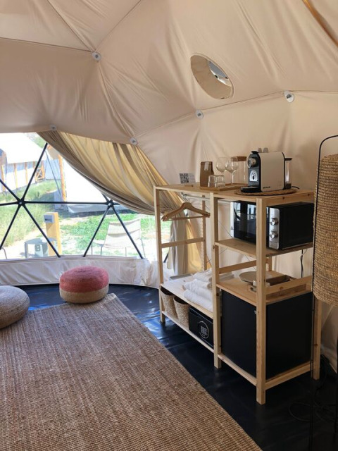 Für alle, die auf der Suche nach einem einzigartigen Naturerlebnis sind, bietet der Domo eine magische Übernachtung unter dem Sternenhimmel. Dank der transparenten Kuppel genießt du abends einen herrlichen Blick auf die Sterne, während du bequem auf einem weichen Doppelbett liegst. Die Einrichtung ist minimalistisch, aber stilvoll, mit Klimaanlage, Bettwäsche, Handtüchern und einer Minibar mit Kühlschrank.