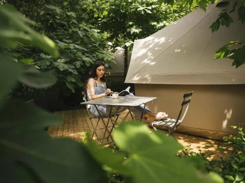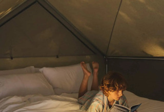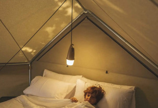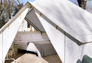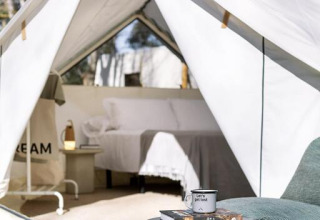 Ideal für Paare oder eine Gruppe von drei Personen. Das geräumige, gemütliche und flexible Interieur sorgt für ein vollständiges Campingerlebnis. Das Zelt befindet sich auf einer Holzveranda mit Gartenset, die als Terrasse genutzt werden kann.