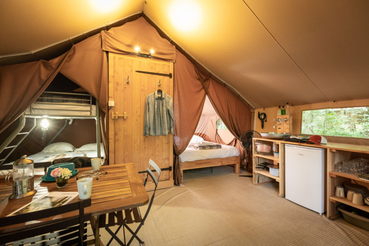 Dieses geräumige Zelt vereint den Charme des Campings mit dem Komfort eines guten Bettes und eines eigenen Badezimmers.
