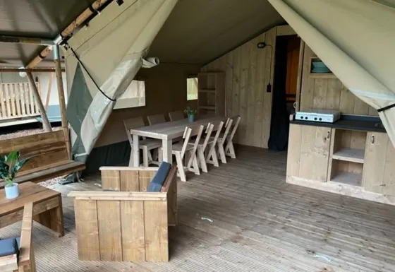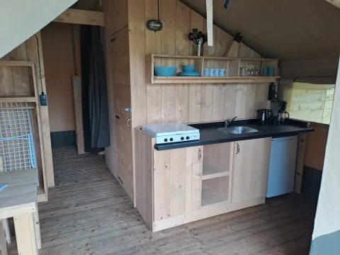 Dieses einzigartige Safarizelt ist mit allem Komfort für den perfekten Glamping-Urlaub ausgestattet! Durch die Holzelemente und die aufrollbare Vorderseite erhältst du das echte Outdoor-Gefühl des Campings, aber mit allem Komfort wie zu Hause. Das Zelt verfügt über eine gemütliche Veranda mit Vordach, um draußen herrlich zu entspannen. Das Safarizelt hat eine komplett eingerichtete Küche mit Inventar und ist ausgestattet mit einem vierflammigen sicheren Gasherd, einem Kühlschrank, einer Kaffeemaschine und einem Wasserkocher. Das Safarizelt ist auch mit einem eigenen Badezimmer mit Dusche, Toilette und Waschbecken ausgestattet. Außerdem gibt es drei Schlafkabinen im Zelt. In einer Schlafkabine steht ein Doppelbett, in einer weiteren zwei Etagenbetten und in der dritten ein Etagenbett. Alle Betten sind inklusive Decken und Kissen.