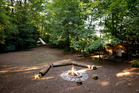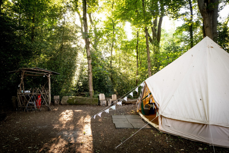 Das Gelände ist komplett autark – es gibt also keinen Strom im Zelt. Ideal, wenn du wirklich abschalten möchtest. Musst du dein Handy aufladen? Kein Problem, die Eigentümer helfen dir gerne in ihrem Haus. Draußen ist das private Waldstück dein Abenteuerspielplatz: Folge geheimen Pfaden, entdecke Holzskulpturen und halte Ausschau nach einheimischer Tierwelt. Ein großartiges Ambiente für Gruppen und ideal für Kinder, die Lager bauen, auf der Reifenschaukel spielen und heruntergefallene Äste fürs Feuer sammeln können.