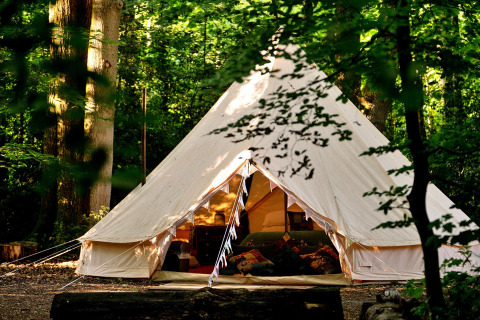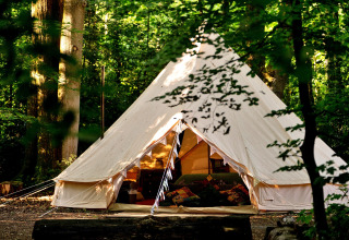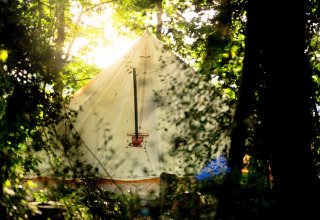 Dein sechs Meter großes Glockenzelt ist hell, luftig und mit Beduinen-Elementen gestaltet: bunte Teppiche, weiche Kissen und ein bequemes Doppelbett sowie ausklappbare Z-Betten, die für zusätzliche Erwachsene oder Kinder genutzt werden können. Es gibt einen Innenholzofen für wohlige Wärme an kühleren Abenden und einen überdachten Sitzbereich draußen, wo du mit einem Getränk entspannen, bis spät in die Nacht plaudern oder einfach den Geräuschen des Waldes lauschen kannst.