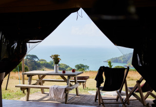 Das Zelthäuschen bietet alles, was du für einen entspannten Aufenthalt brauchst. Im Inneren findest du einen geräumigen Wohnbereich mit einem gemütlichen Sofa und einem großen Esstisch, an dem du mit der ganzen Familie oder Freunden zusammenkommen kannst. Bist du dir nicht sicher, ob du lieber drinnen oder draußen bleiben sollst? Auf der Veranda kannst du im Schatten unter der Markise sitzen, mit einem Picknicktisch und Liegestühlen zum Entspannen.