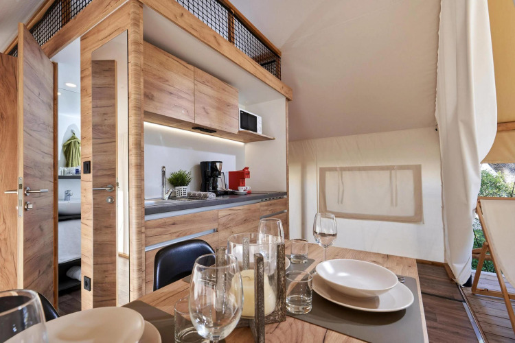 Kiezel Lodge 4 is a spacious glamping tent that stands for camping in luxury. It is suitable for 4 people and accessible via a few steps. The glamping tent has a spacious living room with a dining area and an open kitchen, which is equipped with an induction hob, refrigerator and filter coffee maker. On the ground floor there is a bedroom with a double bed and a TV. The sleeping loft also has a double bed, which can be reached by a ladder. In the modern bathroom you will find a shower, toilet and washbasin. There is no heating. The glamping tent has a spacious veranda. You can park 1 car and free WiFi is available.