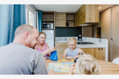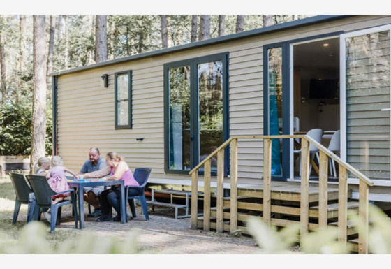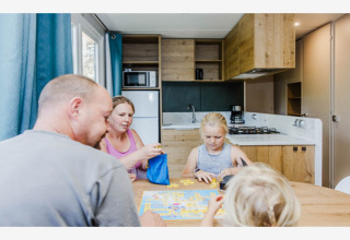 Of course, you stay connected: free Wi-Fi and digital TV are included, and heating keeps the chalet warm on cooler evenings. You can park your car right next to the chalet, so there’s no dragging luggage across the park. One dog is welcome too, so your four-legged friend can join the fun.