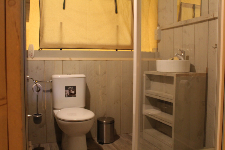 This tastefully decorated safari tent has a living area of about 40m², with standing height in the entire tent, and equipped with a lovely spacious terrace with awning.