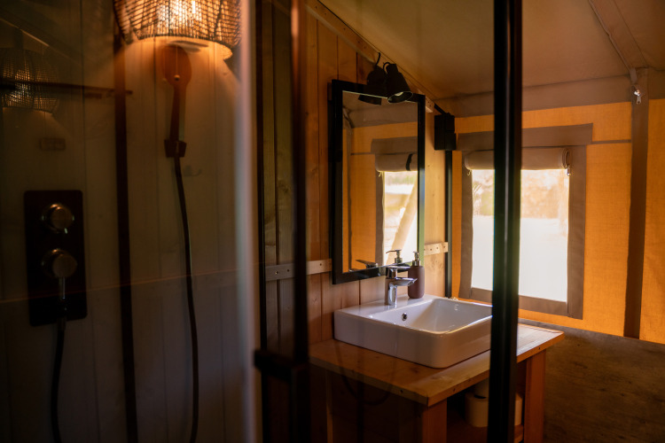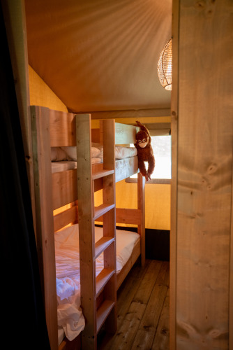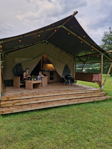 Enjoy a glamping experience in this spacious safari tent, where luxury and nature come together. A covered veranda with lounge set and a view of the lake invites relaxation, while a barbecue makes outdoor cooking easy. The fully equipped kitchen has a 4-burner stove, Dolce Gusto coffee machine, kettle, refrigerator, plates and cutlery. Inside, two sleeping cabins offer a double bed and a bunk bed, including blankets and pillows. The private bathroom is equipped with a shower, toilet, and washbasin, and a drying rack provides extra convenience. A dining table with chairs completes the lodging.