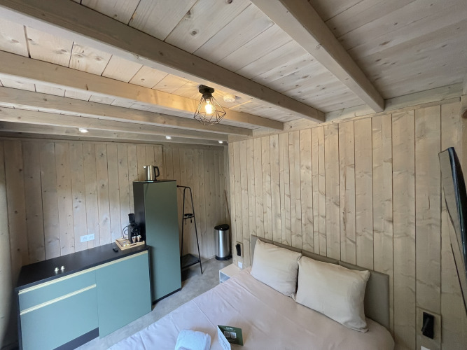 Inside you’ll find a cozy living space with a private bathroom, coffee maker and kettle – ideal for a relaxed start to the day. There is no kitchenette, but there is plenty of storage space, a TV, and a comfortable double bed.