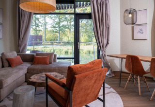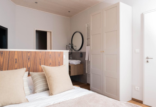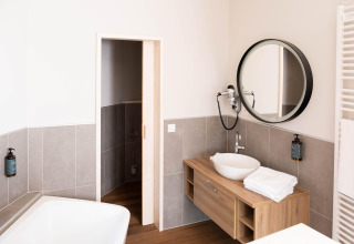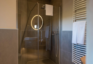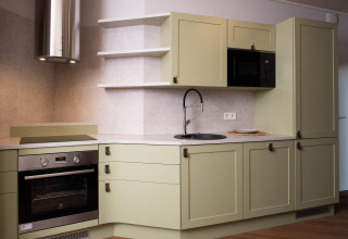 On the ground floor you’ll find a bright, open-plan kitchen and living area. The kitchen is fully equipped with an electric kettle, cooker, coffee machine (pads), oven, dishwasher, and fridge-freezer, so you can easily prepare breakfast, a quick snack or a cosy dinner together. In the living and dining area you can relax on the comfortable seating, enjoy a meal at the dining table or put on your favourite series on the smart TV. On cooler evenings, light the fireplace and create that real holiday feeling.
