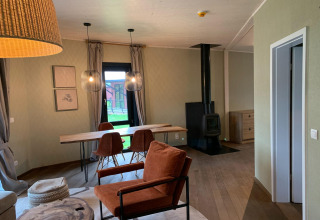 The living area is made for long, lazy evenings together. Cook up a shared meal in the fully equipped kitchen, gather around the dining table for games or drinks, and relax by the fireplace when it gets cooler. Slide open the doors and step onto your private terrace for morning coffee, sunset drinks or a slow breakfast in the fresh air.