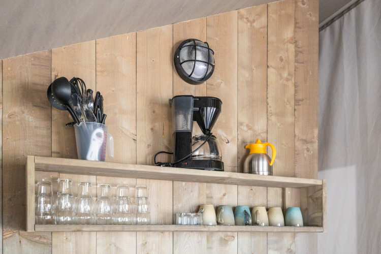 Outside, you can enjoy a large, covered wooden veranda with lounge set, an ideal place to relax in the open air. With the roll-up canvas, you can easily connect the inside with the outside and create extra living space. Here you experience the best of glamping: staying comfortably in the middle of nature, with all amenities within easy reach.