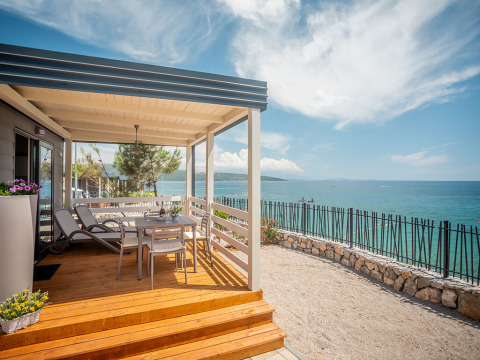 The Lungomare Chalet for 2+1 Spectacular Seaview is located just steps from the beach and the fully equipped seaside promenade in Lungomare Premium Village. The chalet features one bedroom with a double bed and a sofa bed in the living area, a well-equipped kitchen with an electric stove and microwave, and a bathroom with a shower. Guests can relax on the spacious terrace, which offers a seating area and sun loungers, enjoying panoramic sea views, with barbecue facilities available on request. Additional amenities include air conditioning, SAT TV, free Wi-Fi, a safe, and an iron. Covering 18 m² of living space plus a 14 m² terrace, the chalet accommodates up to three adults and allows pets on request. For added convenience, Valfresco Direkt delivers local groceries and freshly prepared ready-to-eat meals directly to your chalet.