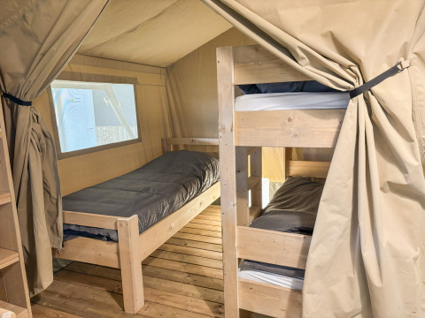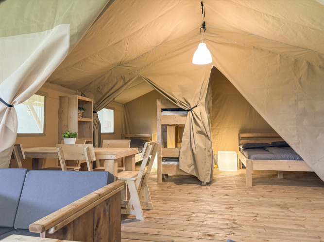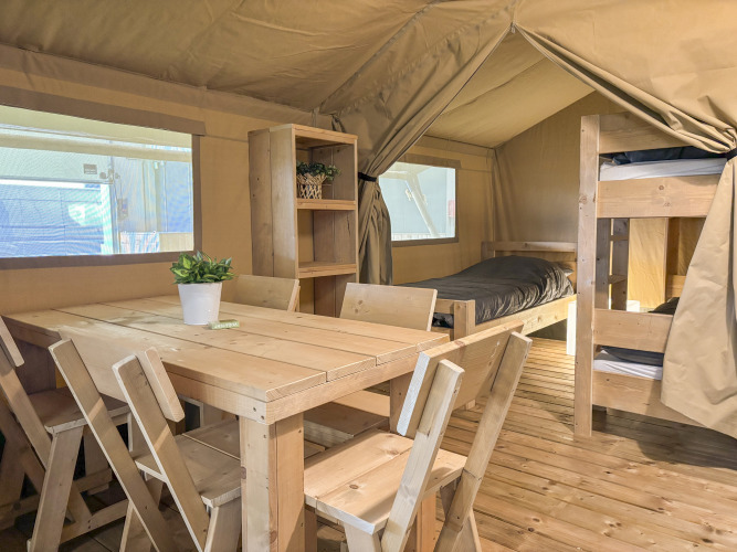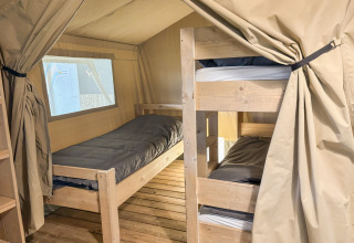 The safaritent has two sleeping cabins: one with a double bed (160x200 cm) and one with a single bed and a bunk bed. All beds come with blankets and pillows.